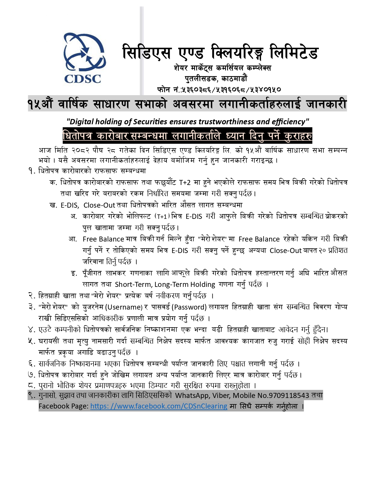 १५औं वार्षिक साधारण सभाको अवसरमा लगानीकर्ताहरुलाई जानकारी !!!