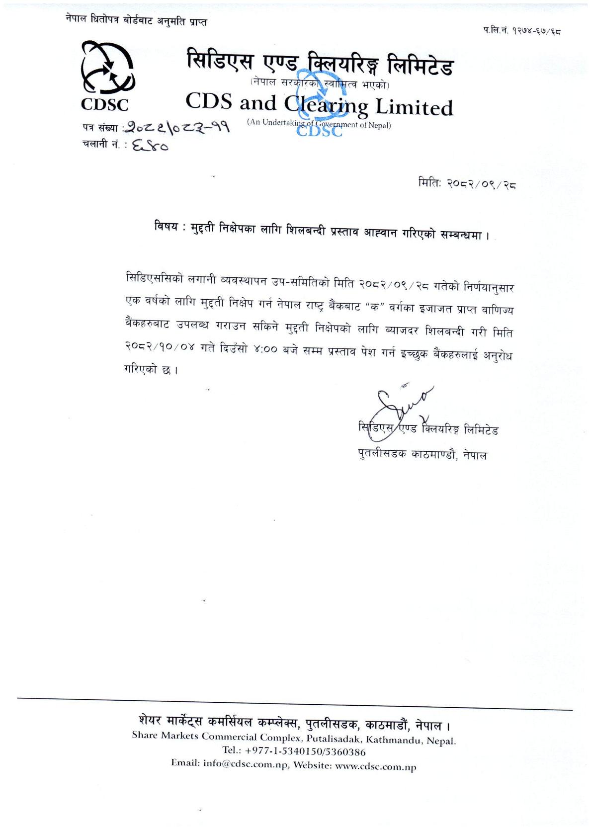 मुद्दती निक्षेपका लागि शिलबन्दी प्रस्ताव आह्वान गरिएको सम्बन्धमा ।