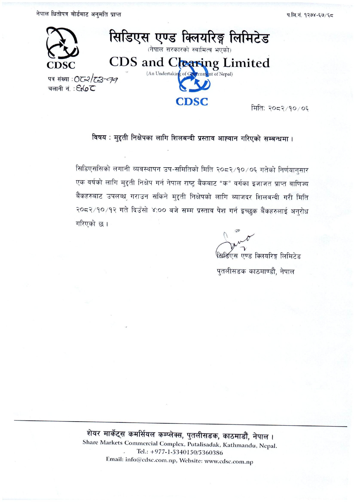 मुद्दती निक्षेपका लागि शिलबन्दी प्रस्ताव आह्वान गरिएको सम्बन्धमा ।